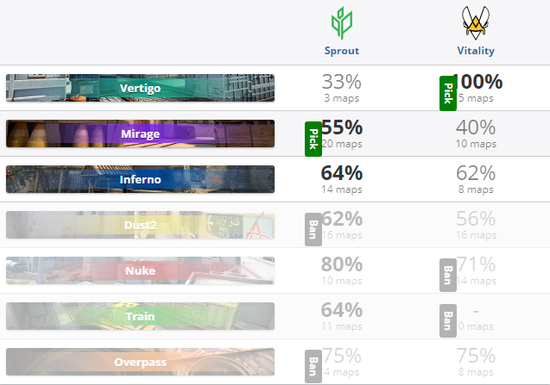Vitality主动选择的Vertigo明显是针对了对手这张图的熟练度不够,ZywOo今天状态也很棒。Sprout仅仅通过两次大狙前压拿首杀的方式拿到三分,半场12-3的比分让第一张地图早早的失去悬念。下半场Sprout没有任何失误的空间,但是随着Vitality一波前顶战术的成功,他们还是16-6拿下了图一。