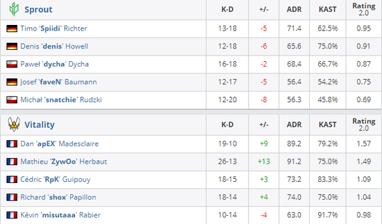 Vitality今天Mirage的战术也及其针对,明显是研究了Sprout的打法,手枪局正确赌对之后长枪局的前顶A1也是克制了Sprout的3A二楼战术。处处受限的Sprout上半场的后半段通过B小夹B拿到些分数。来到下半场,Vitality继续保持着自己的压制力,虽然输掉手枪局,但是在随后的B点快提和A点爆弹中每个人都做到了自己该做的事情。Sprout将希望给予自己的双狙上,但是也仅仅拿了一分。最终Vitality 2-0淘汰Sprout晋级半决赛。
